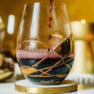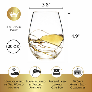 What you’re seeing are real hand painted gold panels adorning a 'Trinity' Stemless Wine Glasses.